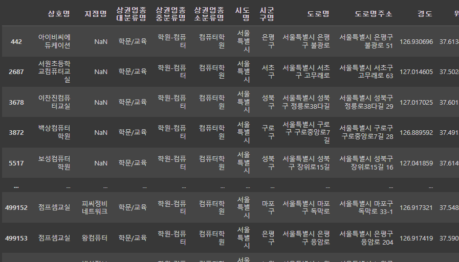 shop_seoul_edu_computer = shop_seoul_edu[shop_seoul_edu['상권업종중분류명'] == '학원-컴퓨터']