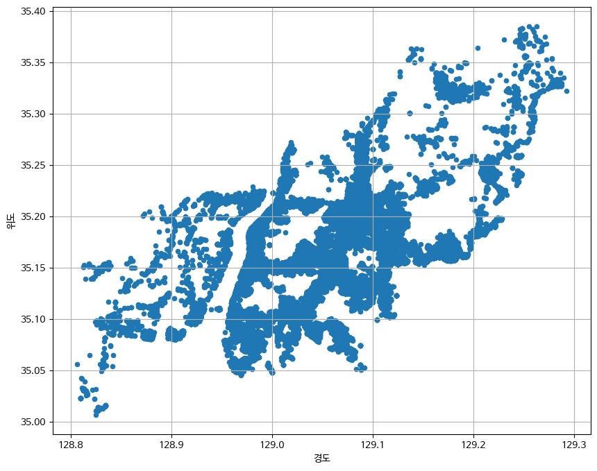 shop_except_seoul.plot.scatter(x='경도', y='위도', grid=True, figsize=(10,8))