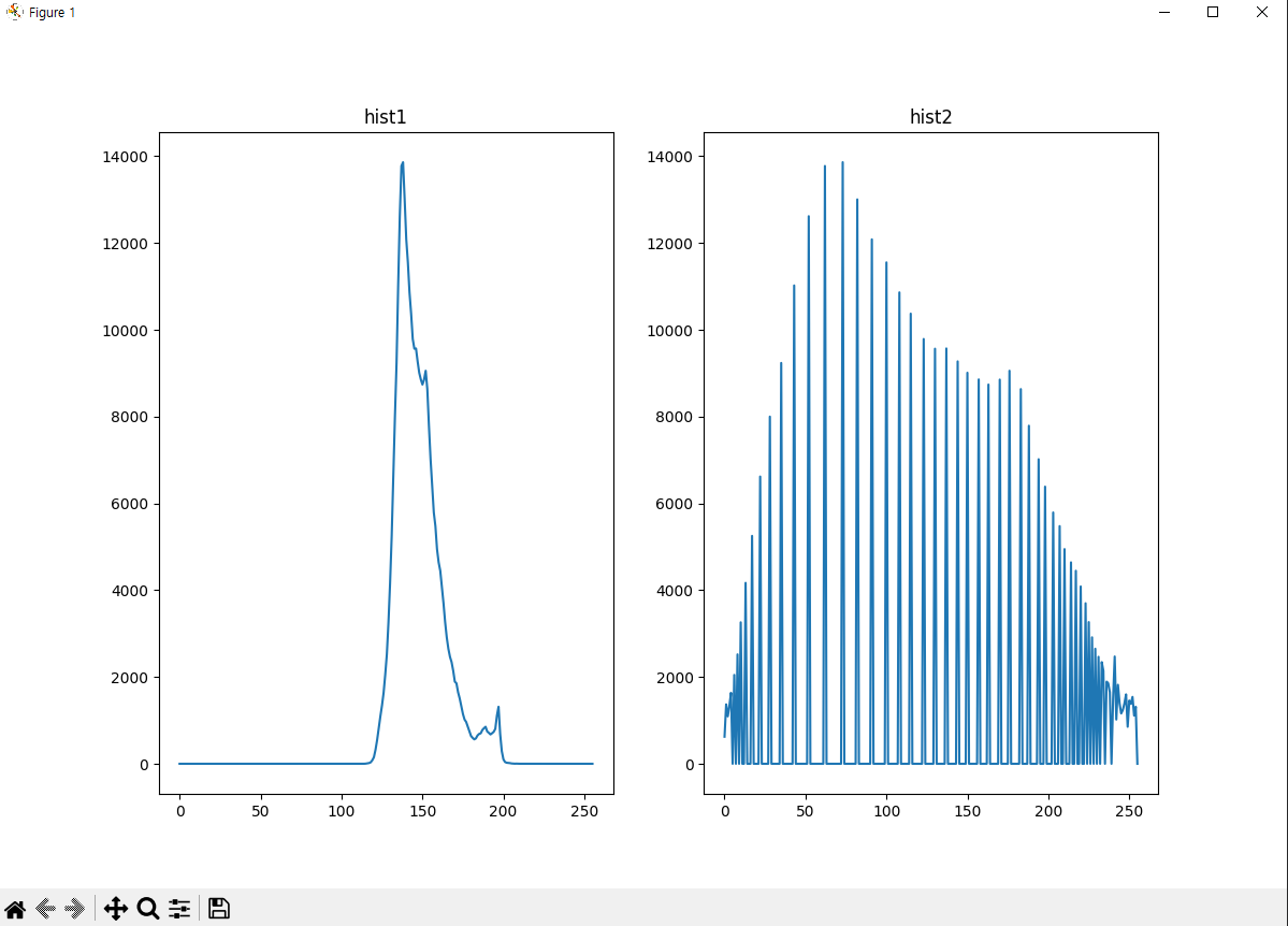 - 화소값을 0 ~ 255 사이에 고르게 분포하도록 개선