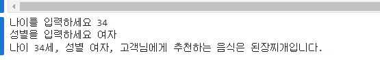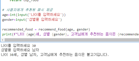 print(f"나이 {age}세, 성별 {gender}, 고객님에게 추천하는 음식은 {recommended_food}입니다