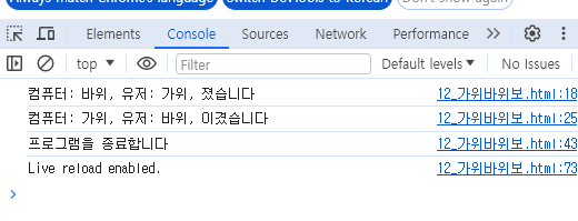 console.log('컴퓨터: 가위, 유저: 바위, 이겼습니다');