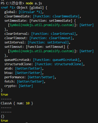 - hello()함수: 위 코드에서 hello함수에서 argument로 this를 선언했습니다. 밑에 this == global로써, this를 전역객체로 설정했습니다. 따라서, hello함수가 호출될 때, this를 전역 객체로 가리키고, 비교결과값은 true가 출력합니다.