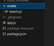 app.js파일에서 express applicaiton안에서 사용되는 라우터를 정의할 파일로 tweets.js 파일을 생성합니다. express.Router()로 router객체를 생성하고, 미들웨어 요청방식이 get, post, put, delete 4가지 방식으로 처리하도록 정의합니다. 미들웨어 요청방식은 CRUD같이 쿼리를 가져오거나, 추가하거나, 수정, 삭제를 설정합니다.