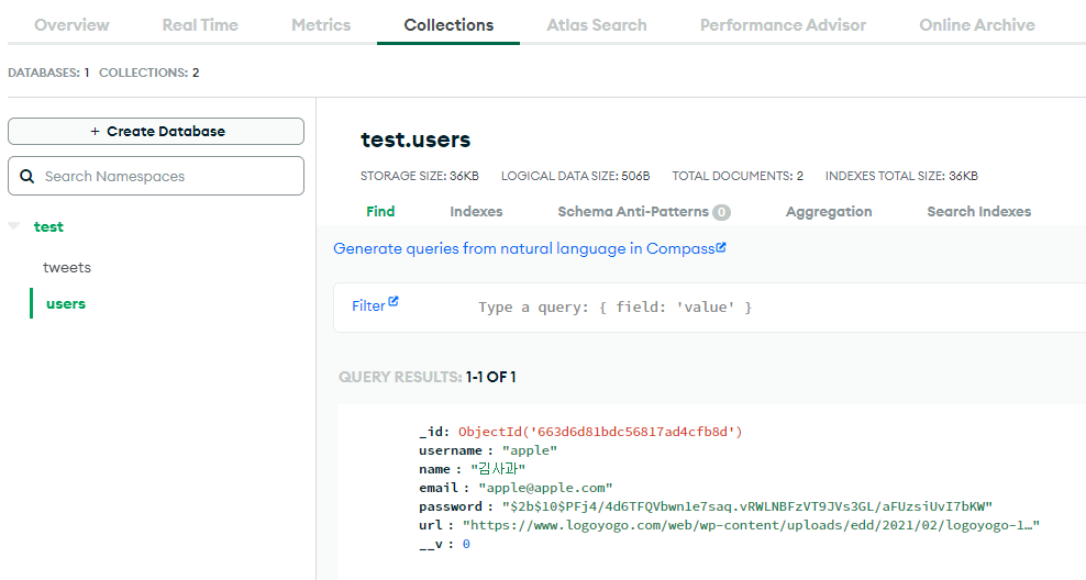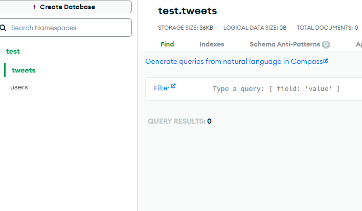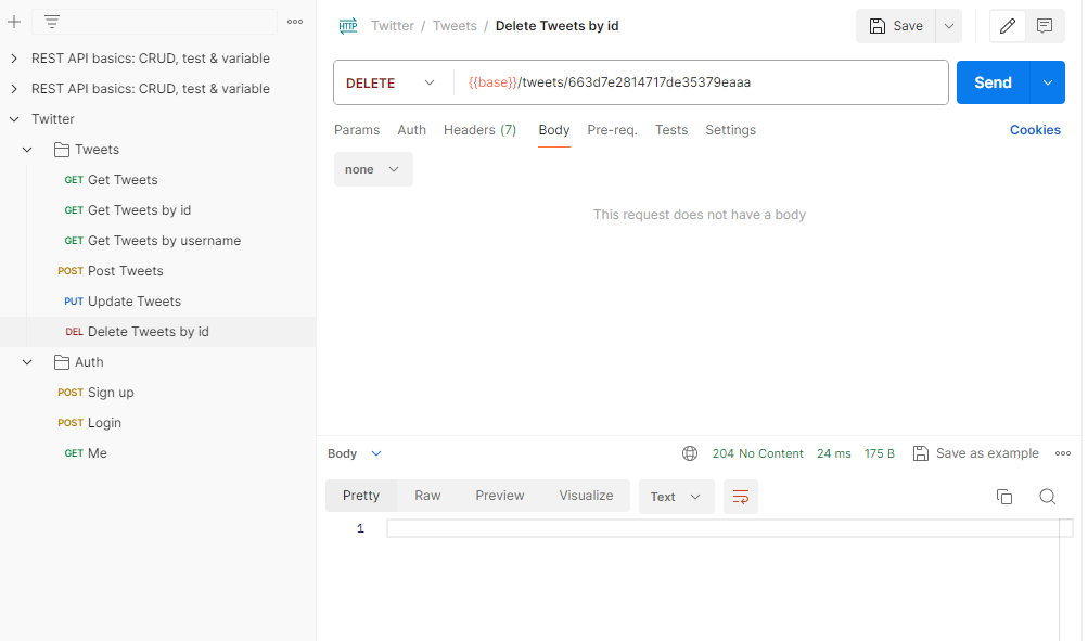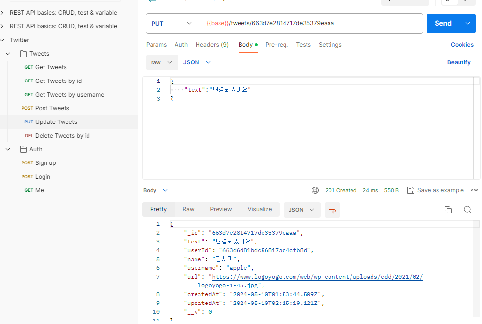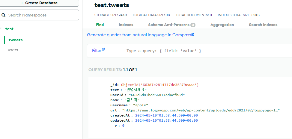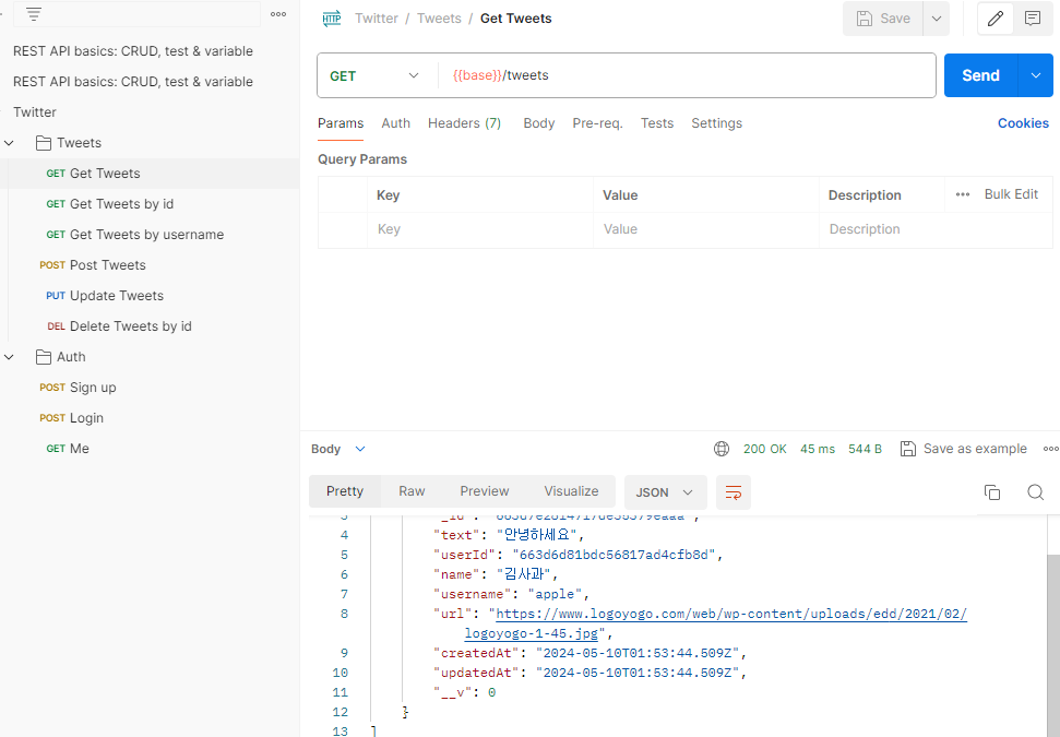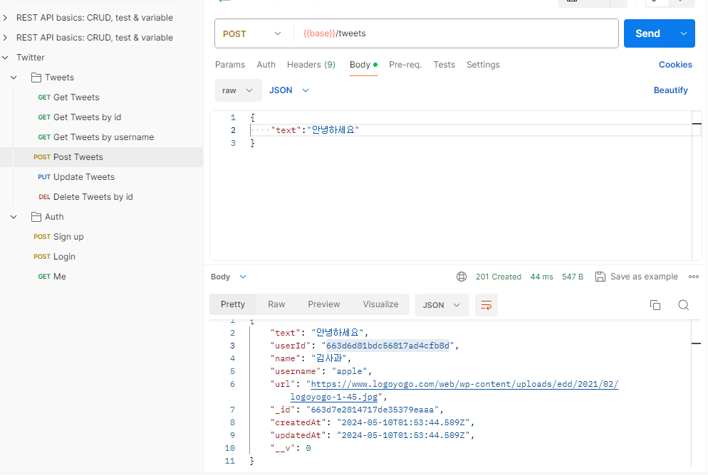 postman에서 tweets폴더로 DB를 새로 생성합니다.